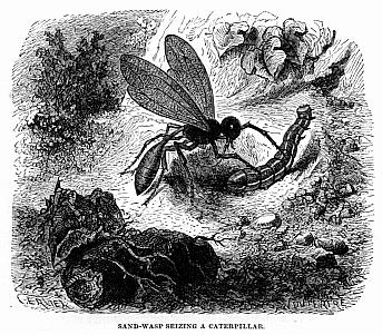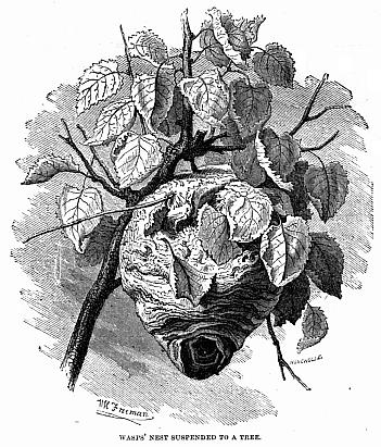 Sometimes three or four would be lying in wait within a few inches of each other, the one crawling over or under the other’s body without hesitation. Soon after sunrise they left their webs, and, retreating to the shade, formed two or three large masses as big as a hat under the thick foliage of a jessamine-tree. There they remained motionless till sunset, when the black lump crumbled to pieces. The process was a curious sight to witness. Then, in a leisurely way, the spiders scattered themselves to their aerial fishing. The air swarmed with mosquitoes, which were caught in great numbers. Larger flies, and especially moths, were at once pounced upon and devoured; a dozen often feeding amicably on the body of the same insect, consuming not only the juices, but the abdomen. When a part of the web was broken, the nearest spider gathered up the loose threads, rolled them into a ball, and ate it. The great difficulty seemed to be how they could convey the first thread, often sixty or seventy feet long, from one tree to the other. This was done by a spider from a tree to windward forming a long line, which blew out and caught in the leaves of a neighbouring tree to leeward. This it tightened, and then crossed hastily backwards and forwards on the line, adding to its thickness on each journey, till it was strong enough to support a web. The spiders thus employed were apparently all young, for as they increased in age the ferocity of the race appeared. There was then a sanguinary battle,—the few survivors, probably females, devouring some of the slain to provide for a future brood, and then dying also.