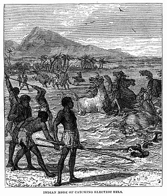 Among the many fine fish in the river is the dorado,—something like a trout in colour, but deeper; in shape, more resembling the snapper. The natives catch it with unbaited hooks. The fisherman selects a point of rock jutting over the stream, and having secured three polished hooks, back to back, attached to a line, throws it as far from him as possible into the water, giving it several strong jerks to make it look like small fry darting about. The dorado makes a dash at them, and gets hooked—generally through the back.
