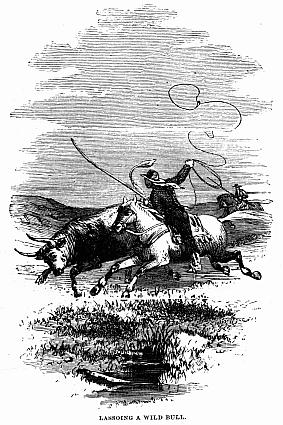 He will gamble on all occasions, either with cards, dominoes, or coin—a pitch-and-toss style of game. His horse-racing is more for the sake of obtaining the bets staked on the match. He also delights to bet on the strength of his horse. This is tried by fastening a pair of horses tail to tail, but at some distance, so that each end of a short lasso is tied to the saddle or girth of either animal. They are then mounted, and urged by whip and spur in opposite directions, until the stronger draws the weaker over the goal—a line marked on the ground. In spite of his gambling propensities, he is often intrusted with hundreds of doubloons for the purchase of cattle by his master.