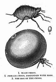 Mr Masterman makes some interesting remarks on the chigo, or sand-flea (Pulex penetrans). It is very minute, not exceeding one twenty-fifth of an inch in length. It burrows between the cuticle and true skin, and there lays its eggs—producing a swelling containing a bluish white sac, about the tenth of an inch in diameter, filled with them. This sac is the developed abdomen of the flea. It preserves its vitality after the death of the rest of the parent; and when that event
