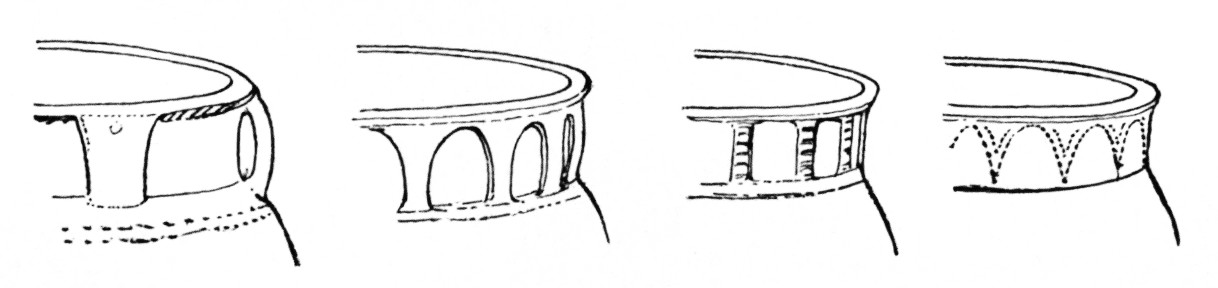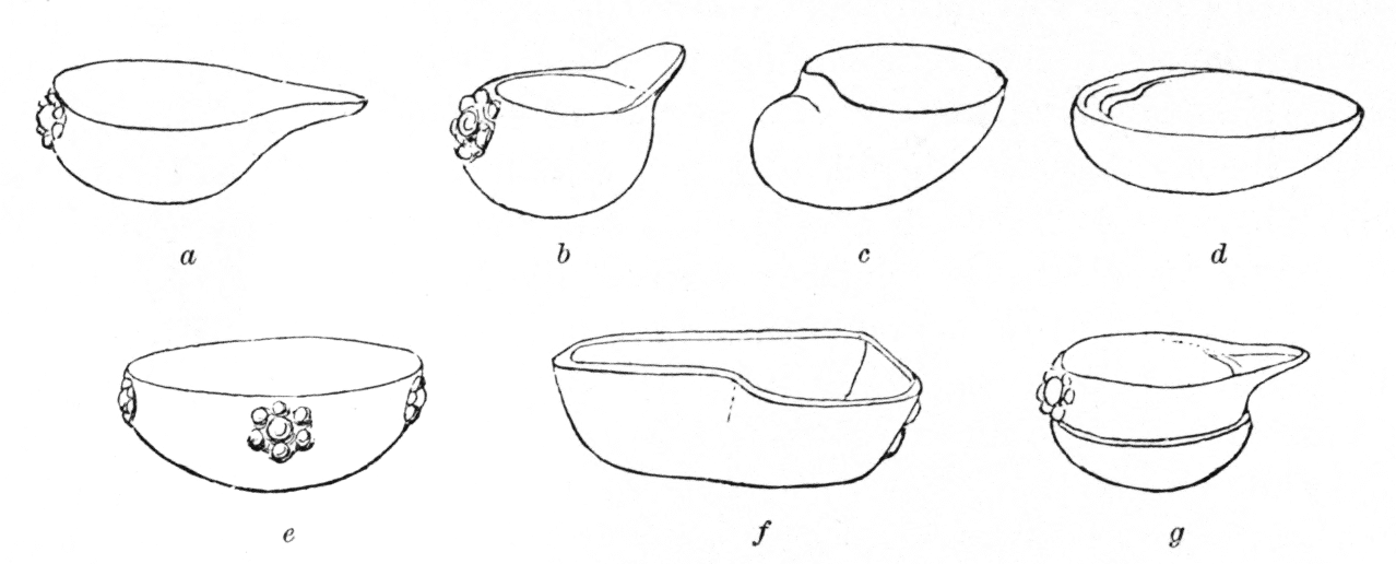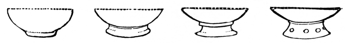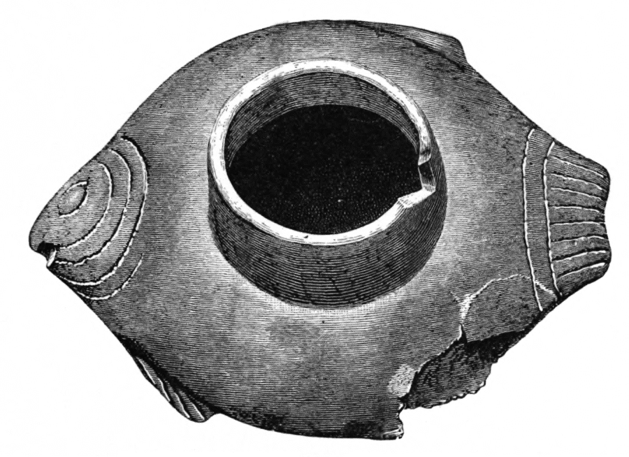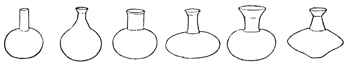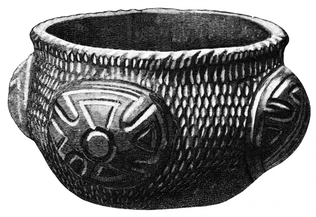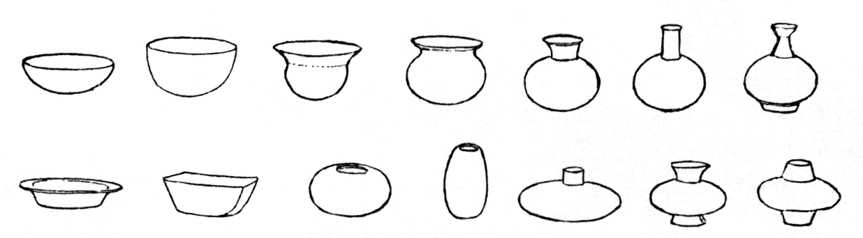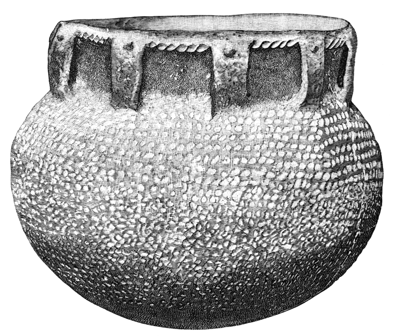 A feature worthy of especial note is the great diversity of form—indicating a long practice of the art, a high specialization of uses, and a considerable variety in the originals copied. The manual skill exhibited is of no mean order. Symmetry of form combined with considerable grace of outline has been achieved without the wheel—a result attained in still greater perfection by other American races. Notwithstanding the great diversity of the forms of vessels, the very primitive condition of the art is indicated by the absence of bricks, tiles, whistles, lamps, spindle-whorls, toys, and statuettes. The models from which the vessels were copied must have been quite varied, comprising shells of mollusks—marine and fresh-water—gourd shells of varying shapes, and vessels of wicker, bark, horn, and wood, such as are in common use with our western and northern tribes.