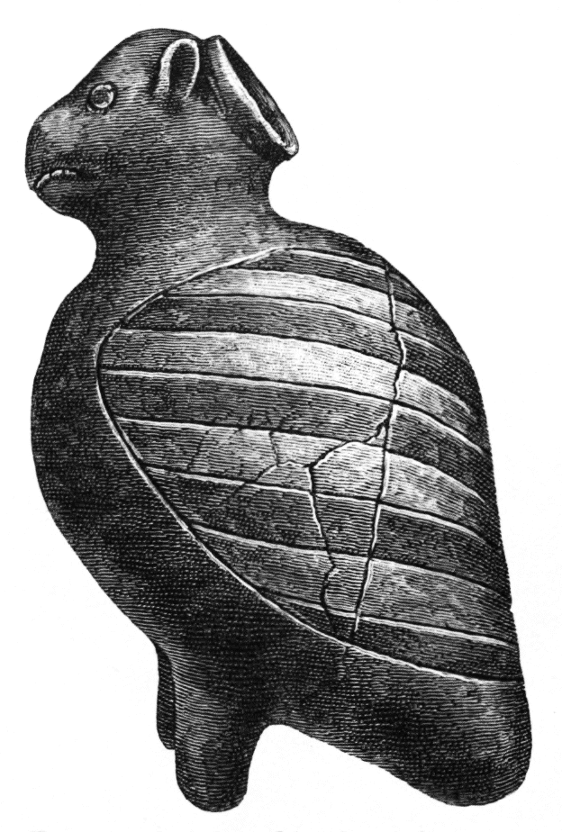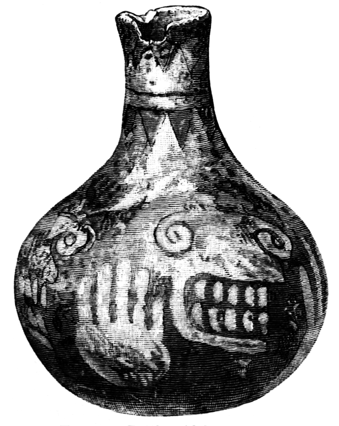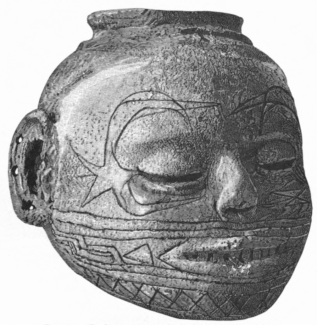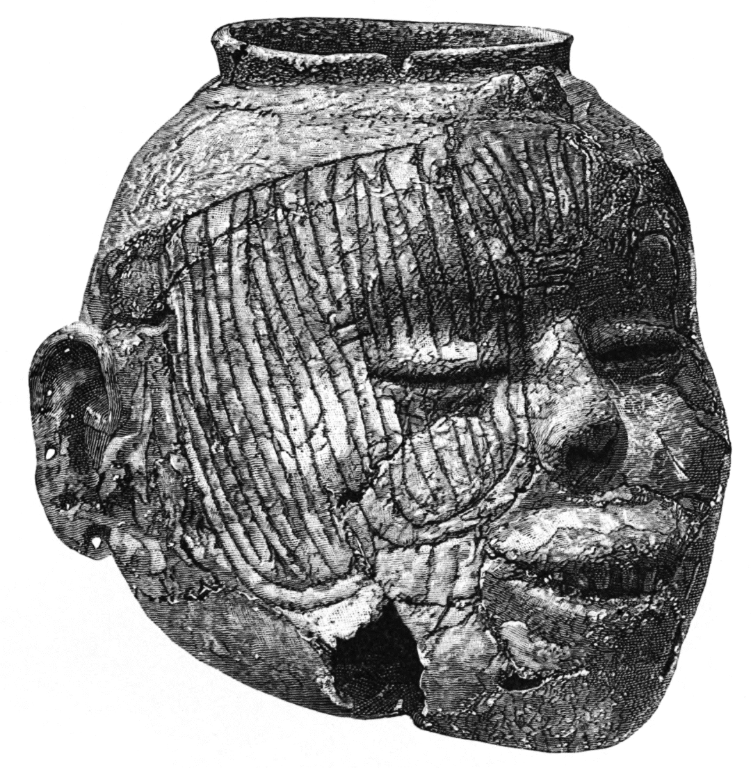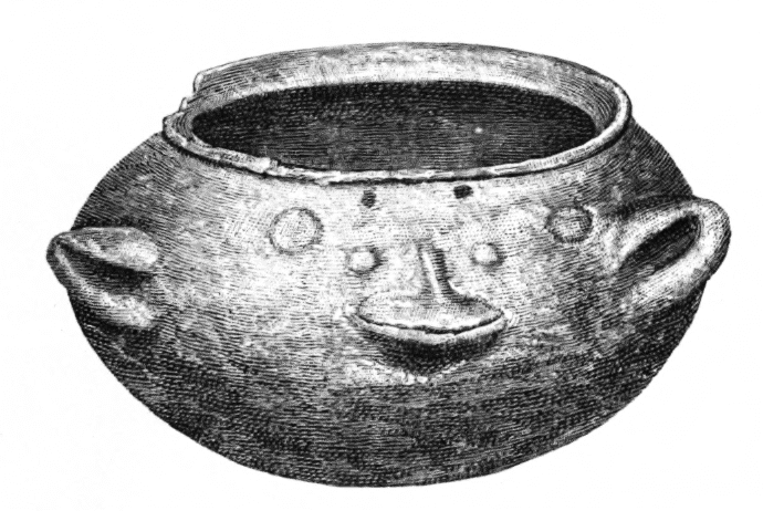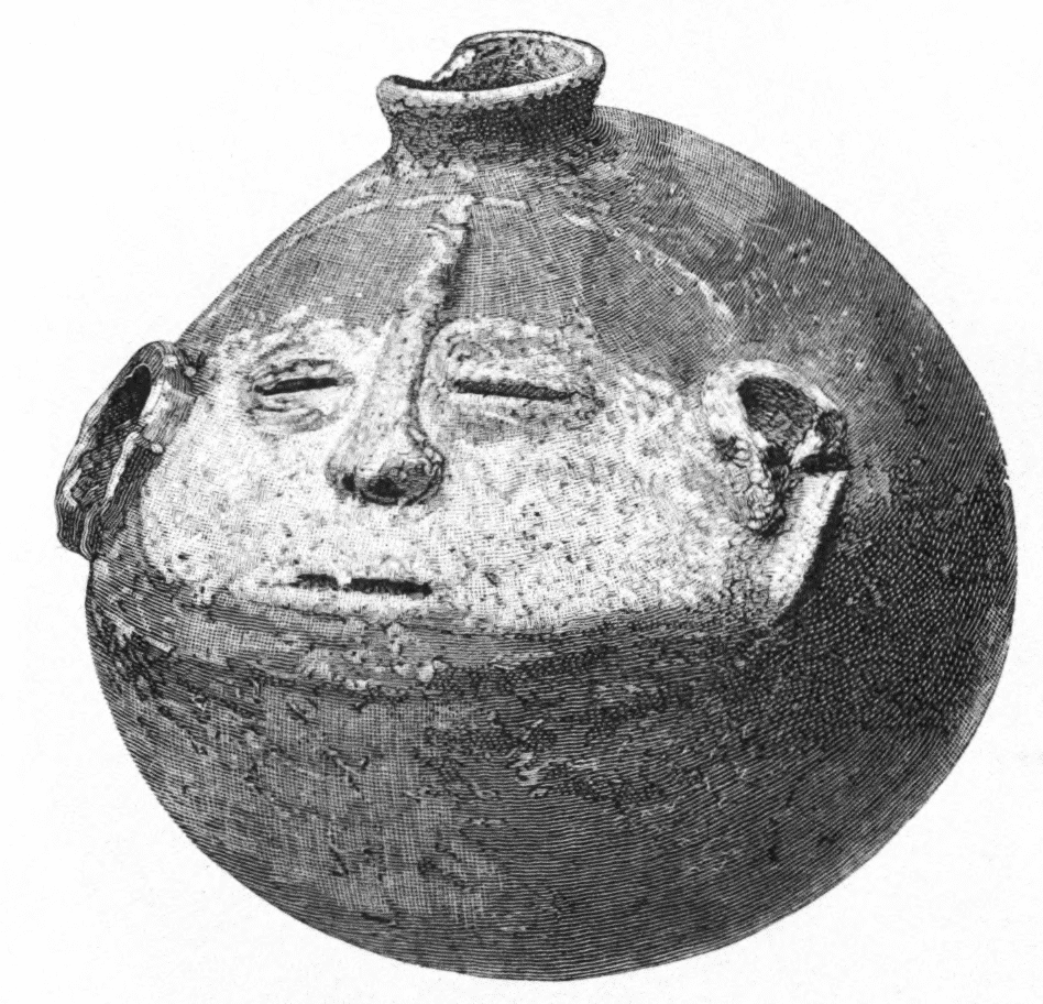 The modeling of life forms in connection with earthen vessels constitutes a feature of considerable interest, the highest known achievement being represented by a series of vases imitating human heads. Animal forms are generally rudely modeled, the imitation of nature having been apparently a secondary consideration—the associated idea or the fancy for the grotesque being the stronger motive. The animal forms are inferior to those carved in stone by some of the mound-building peoples.