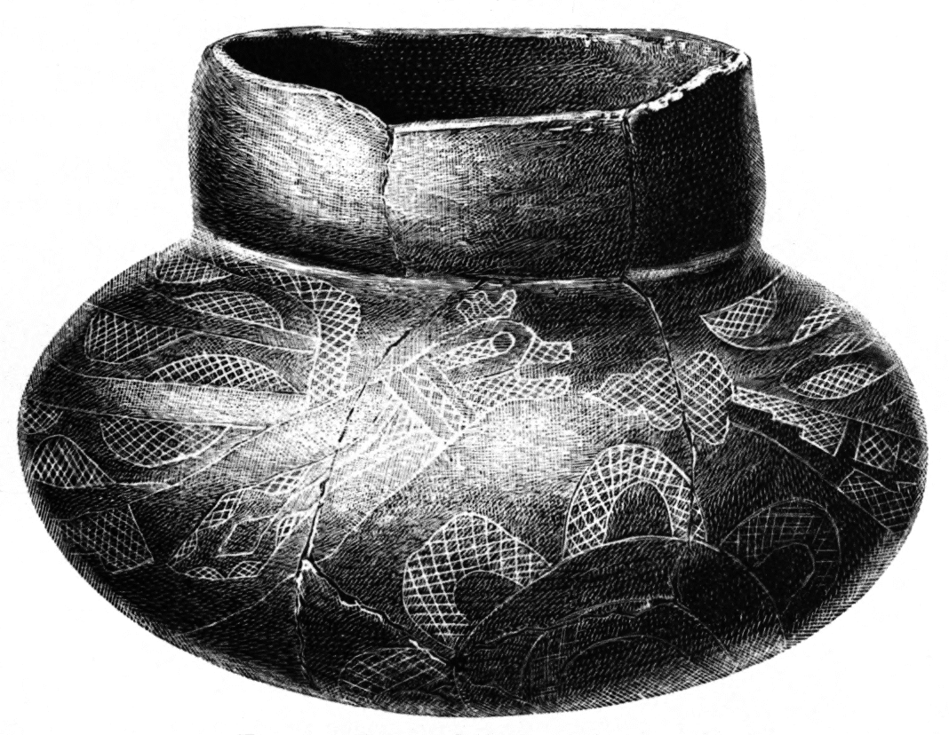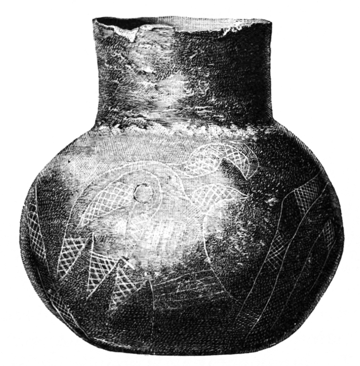 In subject-matter the ornament employed bespeaks nothing higher perhaps than could be expected of our historic tribes. The great body of the devices are geometric, and comprise such motives as could have developed within the art or that might have been borrowed from closely associated arts. A small percentage of incised linear designs come, apparently, from mythologic sources, and delineate, in a rude way, both men and animals.