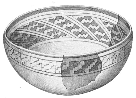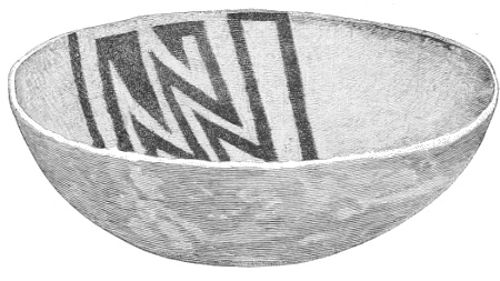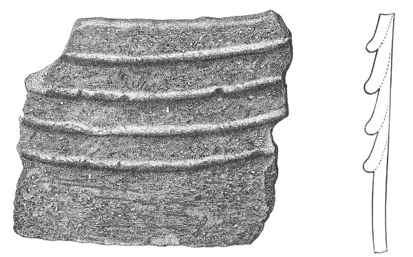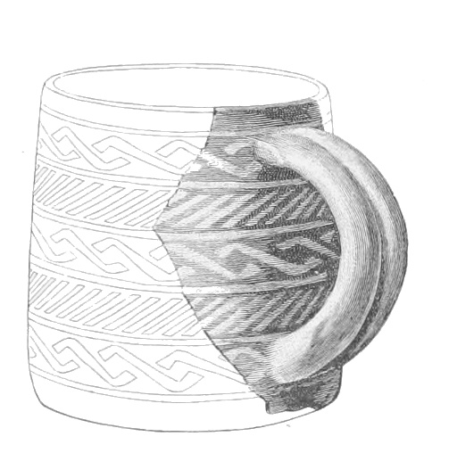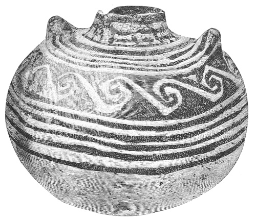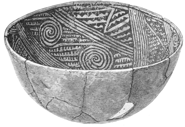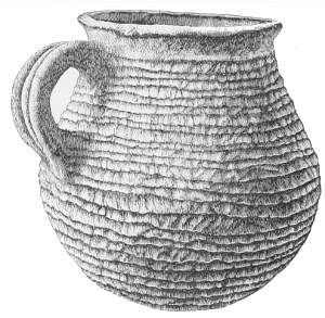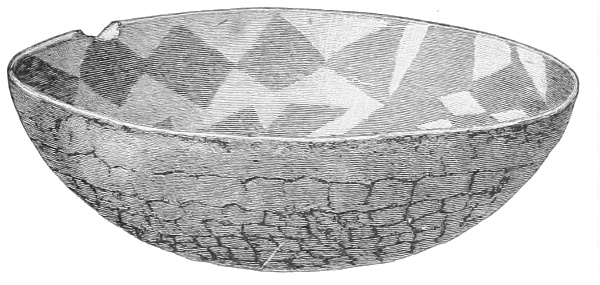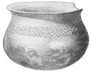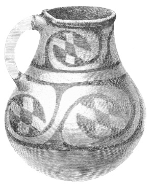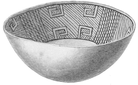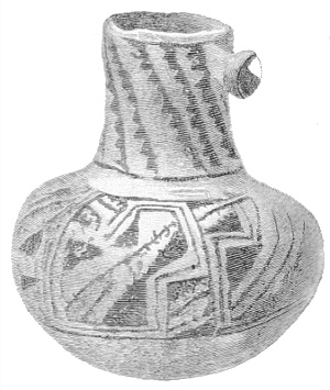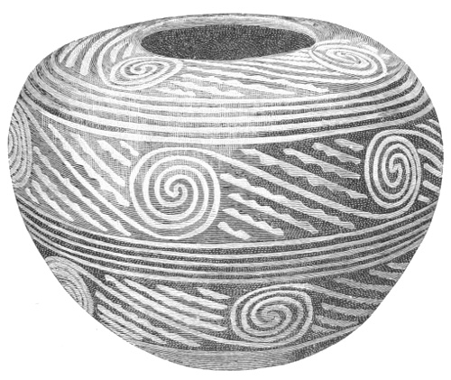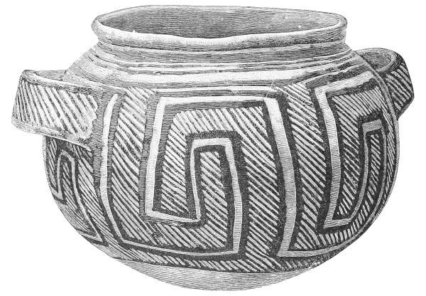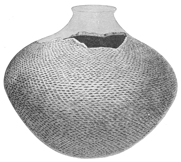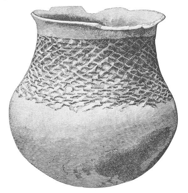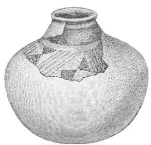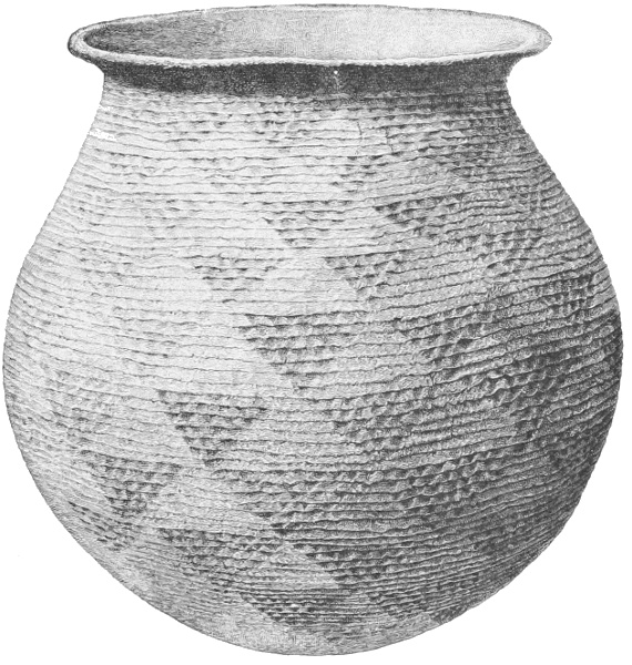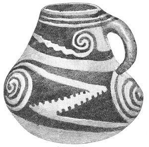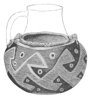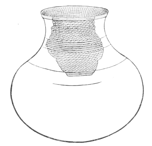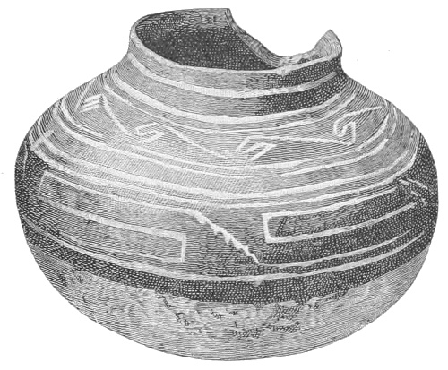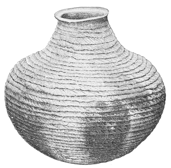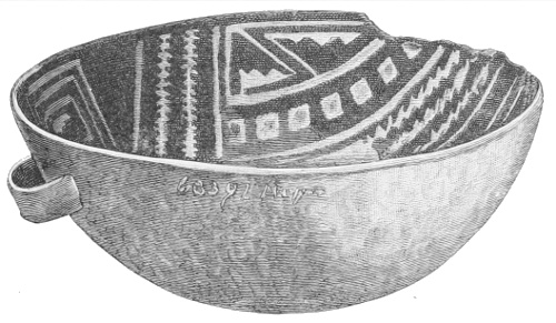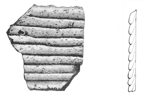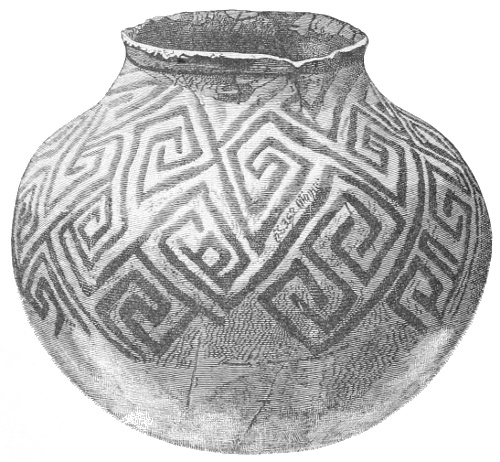 Tempering.—The materials used in tempering do not often come into notice. It appears that, in a majority of cases, fine sand, probably derived from naturally disintegrated rocks, was employed. A large percentage of rather coarse sand is found in the more roughly finished coil-made ware, but vessels intended for smooth finish have little perceptible tempering material.