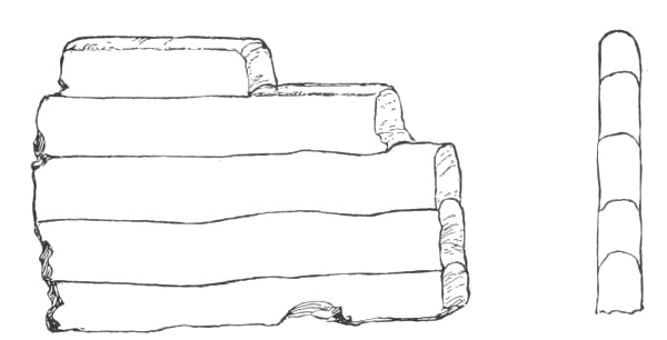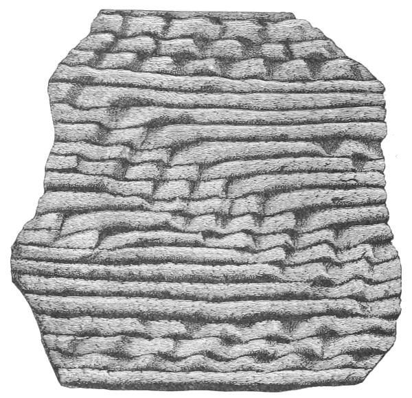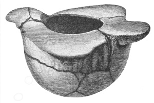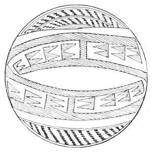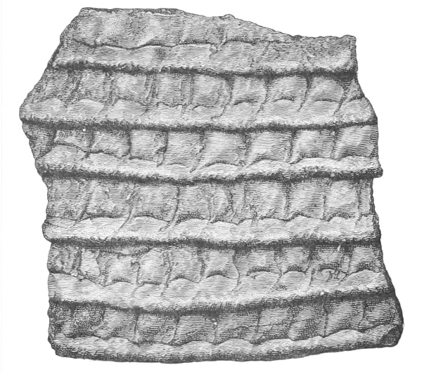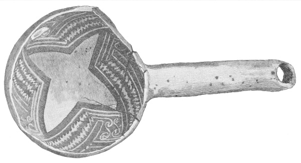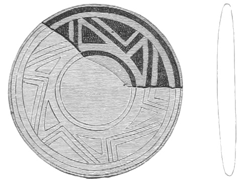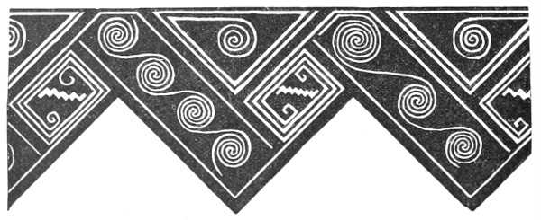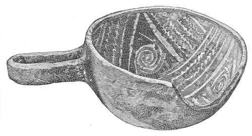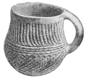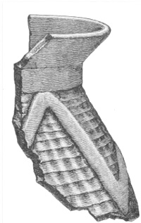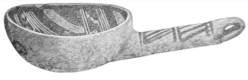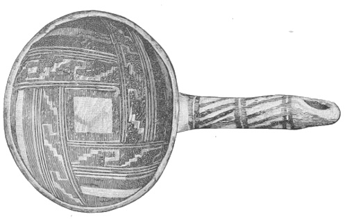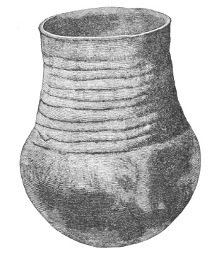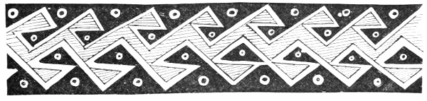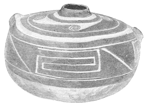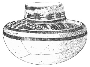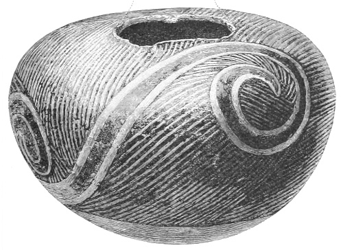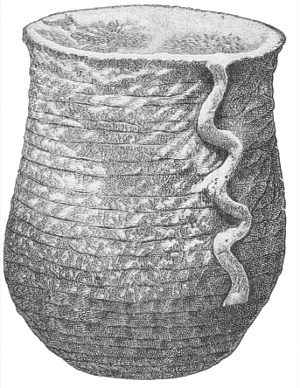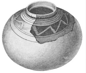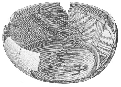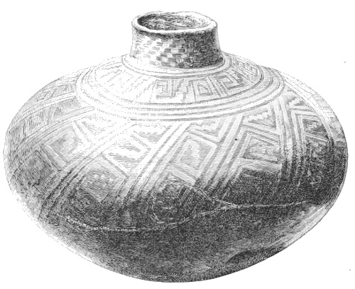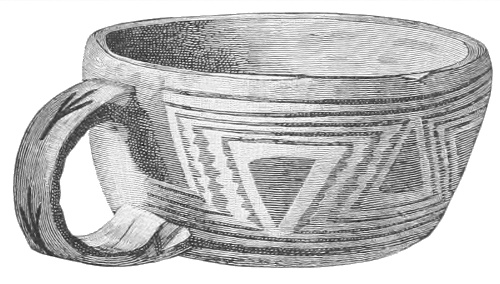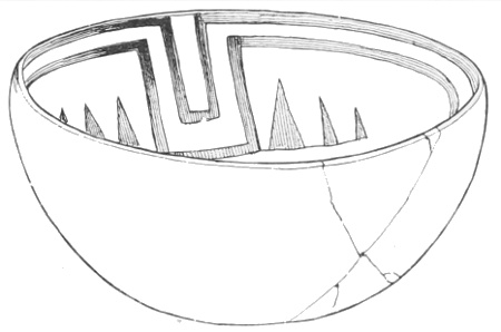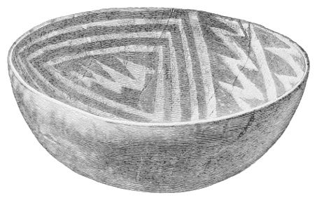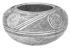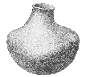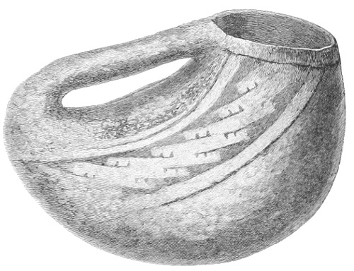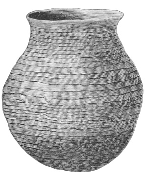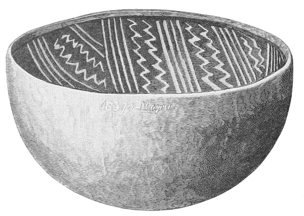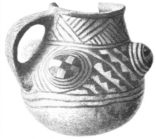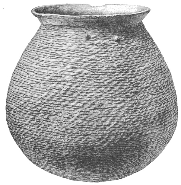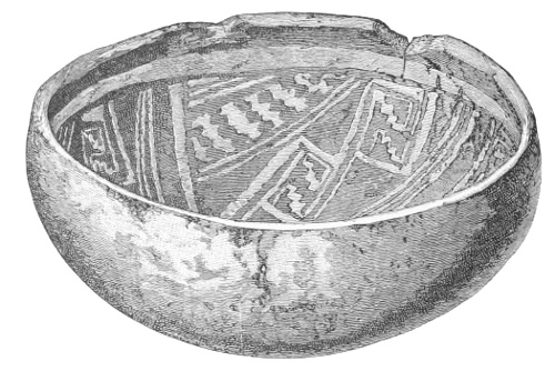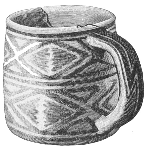 Tempering.—The materials used in tempering do not often come into notice. It appears that, in a majority of cases, fine sand, probably derived from naturally disintegrated rocks, was employed. A large percentage of rather coarse sand is found in the more roughly finished coil-made ware, but vessels intended for smooth finish have little perceptible tempering material.