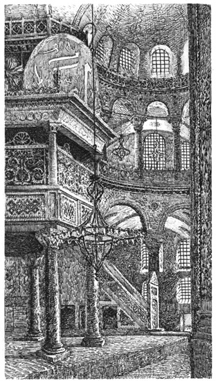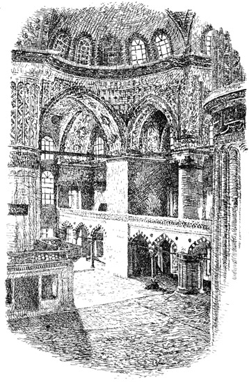 [32] The icons were hewn down, the ornaments everywhere torn off, the altar stripped of its coverings, the lamps and sacred vessels stolen; everything, says Ducas, of silver and gold or other precious substance was taken away, and the church was left naked and desolate.