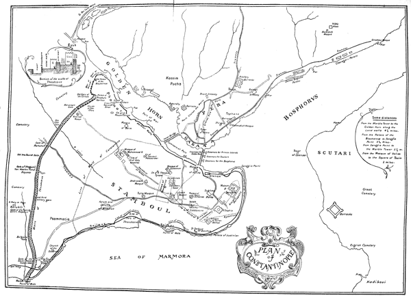 The limits of the series have compelled me to confine myself chiefly to the story of Constantinople as a mediæval town. Thus I have been reluctantly compelled to leave out much that I should have liked to say about Skutari, the Bosphorus and its palaces, and the present social life and religious observances, the Dervishes, the "Sweet Waters," and many familiar names.