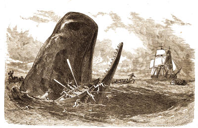 I stood, for a time, regarding this picture in silent admiration, and especially commiserating the situation of one luckless mariner, for whom the fate of Jonah seemed inevitable, as he appeared suspended in mid-air, directly over the jaws of the whale, which were widely distended in his agony.