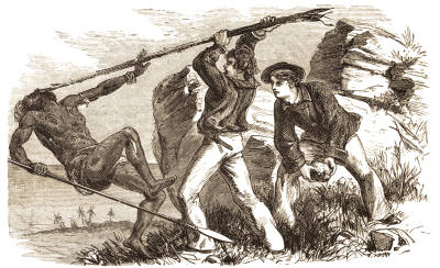 We hove to off the place indicated, and lowered our boat, taking the convict himself as our pilot. He shook hands heartily with everybody, seeming neither elated[300] nor despondent, but self-collected and impassible as he always was. He took with him nothing but an old musket and some ammunition which the old man had given him. We rounded a point of rocks and pulled a short distance into the bay, when two Maories, on an elevation a short distance from us, hailed us, at the same time bringing their muskets up to the shoulder. We ceased pulling and lay on our oars. The convict rose and answered them in their own dialect, seeming to speak it quite fluently. They answered again, and a short conference seemed to produce satisfactory results, for they lowered their guns and descended the hill towards us, after giving a louder shout than any before, to which we could hear a responsive yell from voices further up the bay.