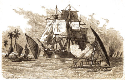 The inspiring cry of "There she blows!" greeted our ears the third day after leaving Sydney, and two sixty-barrel bulls, tugging at the fluke-chains that night, were the rich reward of our hard day's labor, putting us all in high spirits, for another hundred barrels would fill the ship, and this we hoped to get somewhere on the passage. Our progress was somewhat delayed, of course, as we were obliged to lose the fair wind while cutting. We had the last "junk" in the tackles, when a sail was seen to windward running down across us, and, on drawing nearer, was made out to be a small hermaphrodite brig. He seemed to recognize us, for, instead of running down across us, he rounded to windward and lowered his boat. As he came up to the wind, exposing his broadside to view, we had no difficulty in recognizing a little brigantine that lay a little inshore of us, while in Sydney. "That's the Paramatta!" said a dozen voices at once, and no one knew her better than our supernumerary shipmate. He said not a word to those near him, but went aft to the captain. He stood respectfully on the lee side of the quarter deck, waiting till the old man[295] should be at liberty to notice him. Nothing in his manner or appearance indicated that he was at all disturbed or alarmed.