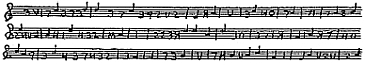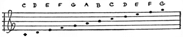 “The dot on the line below the five lines which are joined together by the sign of the treble clef is C. The dot on the space between that and the first of the five lines is D. The dot on the first line is E; on the next space is F, and so forth, in their alphabetical order on the alternating lines and spaces. Do you see how easily, they could be used as the letters of words in a cryptogram, by any one of an ingenious turn of mind? Of 302 course, each bar––that is, each section enclosed by lines running straight up and down––represents a word. Now for the rest of it: