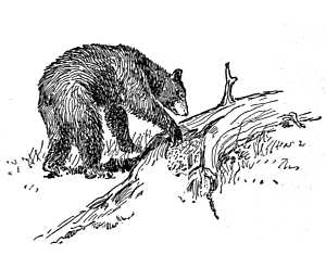 Another habit in which he has improved upon Mooween is his fishing. He knows how to flip fish out of water with his paw, as all bears do; but he has also learned how to attract them when they are not to be found on the shallows. Many times in the twilight I have found Mooweesuk sitting very still on a rock or gray log beside the pond or river, his soft colors and his stillness making him seem like part of the shore. Other naturalists and hunters have mentioned the same thing, and their testimony generally agrees in this: that Mooweesuk's eyes are half shut at such times, and his sensitive feelers, or whiskers, are playing on the surface of the water. The fish below, seeing this slight motion but not seeing the animal above, attracted either by curiosity or, more likely, by the thought of insects playing, rise to the surface and are snapped out by a sweep of Mooweesuk's paw.