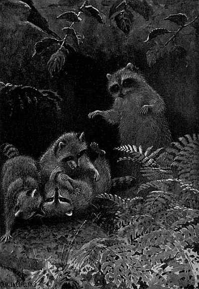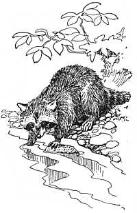 In the midst of this quiet play there came a faint ripple and splash of water, and the little coons dropped their plaything and stood listening, eyes all bright behind their dark goggles, noses wiggling, and ears cocked at the plashing on the pond shore. The mother was there diligently sousing something that she had caught; and presently she appeared and the little ones forgot their play in the joy of eating. But it was too far away and the shadows were now too dark to see what it was that she had brought home, and how she divided it among them. When she went away again it had grown dark enough for safety, and the young followed her in single file to the pond shore, where I soon lost them among the cool shadows.