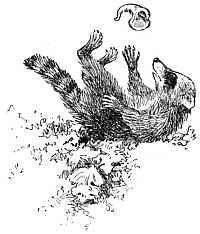 He carried it back to where the young coons were playing, lay down among them, and began to play by himself, passing the plaything back and forth through his wonderful[25] front paws, striking it up, catching it, and rolling it around his neck and under his body, as a child does who has but one plaything. Some of the other coons joined him, and the little crooked knot went whirling back and forth between them, was rolled and caught, and hidden and found again,—all in silent intentness and with a pleasure that even in the twilight was unmistakable.