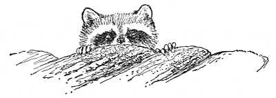 Fortunately such troublous times are rare in Mooweesuk's life, and the wilderness coon knows little about them. His life from beginning to end is generally a peaceable one, full of good things to eat, and of sleep and play and a growing knowledge of the woods. He is born in the spring, a wee, blind, hairless little fellow, like a mole or a bear cub. As he grows he climbs to the entrance to his den, and will sit there as at a window for[40] hours at a time, just his nose and eye visible, looking out on the new, bright, rustling world of woods, and blinking sleepily in the flickering sunshine. Then come the long excursions with his mother, at first by day when savage beasts are quiet, then at twilight, and then at last the long night rambles, in which, following his leader, he learns a hundred things that a coon must know: to follow the same paths till he comprehends the woods; to poke his inquisitive nose into every crack and cranny, for the best morsels on his bill of fare hide themselves in such places; to sleep for a little nap when he is tired, resting on his forehead so as to hide his brightly marked face and make himself inconspicuous, like a rock or a lichen-covered stump; to leap down from the tallest tree without hurting himself; and when he uses a den in the earth or rocks, to have an exit some distance away from the entrance, and never under any circumstances to enter his den save by his front door. There is great wisdom in this last teaching. When a dog finds a hole with a trail that always leads out[41] of it he goes away, knowing it is of no use to bark there; but when he finds an opening into which a trail is leading, he thinks of course that his game is inside, and proceeds to howl and to dig without ever a thought in his foolish head that there may be another way out. Meanwhile, as he digs and raises an unpardonable row in the quiet woods, Mooweesuk will either wait just inside the entrance till she gets a chance to nip the dog's nose or crush his paw, or else will slip quietly out of the back door with her little ones and take them off to a hollow tree where they can sleep in peace and have no fear till the dog goes away.