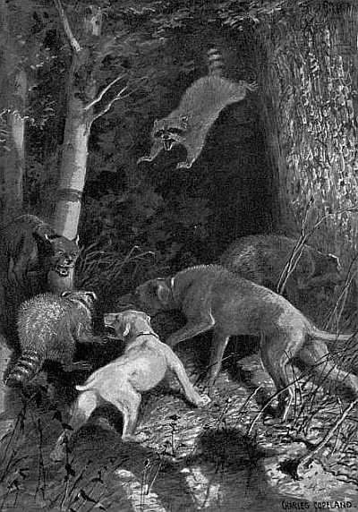 That was the beginning of a long acquaintance, cultivated sometimes by day, more often by night; sometimes alone, when I would catch one of the family fishing or clamming or grubbing roots or nest robbing; sometimes with a boy, who caught two of the family in his traps; and again with the hunters under the September moon, when some foxy old coon would gather a freebooter band about him and lead them out to a raid on the corn-fields. There each coon turned himself promptly into an agent of destruction and, reveling in the unwonted abundance, would pull down and destroy like a child savage, and taste twenty milky ears of corn before he found one that suited him perfectly; and then, too full for play or for roaming about to find all the hollow trees in the woods, he would take himself off to the nearest good den and sleep till he was hungry again and the low whinny of the old leader called him out for another raid.