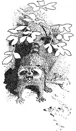 By the time the first snows blow the little coons are well grown and strong enough to take good care of themselves; and then, like the bear again, they escape the cold and the hunger of winter by going to sleep for four or five months in a warm den that they have selected carefully during their summer wanderings. They are fat as butter when they curl themselves up for their long sleep; their ringed tails cover their sensitive[42] noses, and if they waken for a time they suck their paws drowsily till they sleep again, so that, like the bear, they are often tender-footed when they come out in the spring.