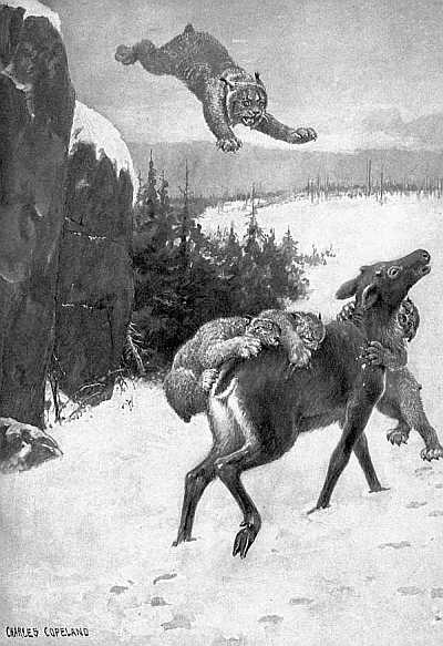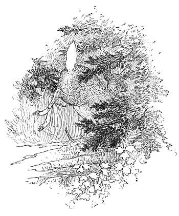 Watching them thus at their play, the meaning of a curious bit of deer anatomy became clear. A deer's shoulder is not attached to the skeleton at all; it lies loosely inside the skin, with only a bit of delicate elastic tissue joining it to the muscles of the body. When a deer was headed suddenly and braced himself in his tracks, the body would lunge forward till the fore legs seemed hung almost in the middle of his belly. Again, when he kicked up his heels, they would seem to be supporting his neck, far forward of where they properly belonged. This free action of the shoulder is what gives the wonderful flexibility and grace to a deer's movements, just as it takes and softens all[252] the shock of falling in his high-jumping run among the rocks and over the endless windfalls of the wilderness.