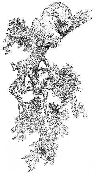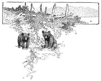 The mother came out first and sagged away backwards down the tree, swinging her head from side to side to look down and see how far yet, in true bear fashion. The four little ones followed her, clawing and whining their way to the bottom—all but one, who when half-way down turned and jumped,[21] [23]landing on his mother's soft back to save himself trouble. Then she led the way to the doorway among the rocks, and the young followed in single file, winding about on her trail, stopping and sniffing when she did, and imitating her every action, just as young bear cubs do when roaming about the woods.