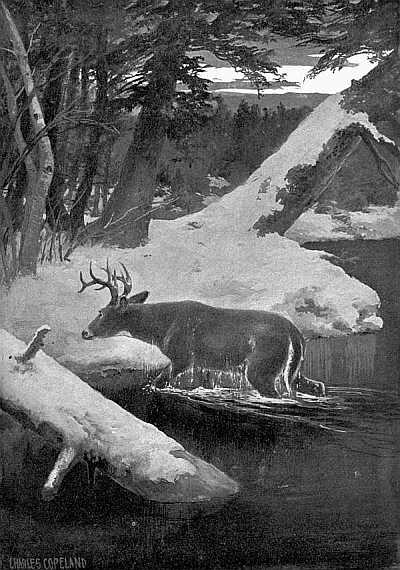 Last summer, just below my camp on Matagammon, was a little beach between two points surrounded by dense woods that the deer seemed to love better than any other spot on the whole lake. When we first arrived the deer were close about our camp. From the door we could sometimes see them on the lake shore, and every evening at twilight they would steal up shyly to eat the potato and apple parings. Gradually the noises of camp drove them far back on the ridges, though on stormy nights they would come back when the camp was still and all lights out. From my tent I would hear cautious rustlings or the crack of a twig above the drip and pour of raindrops on my tent-fly, and stealing out in the darkness would find two or three deer, generally a doe and her fawns, standing under the split roof of our woodshed to escape the pelting rain.