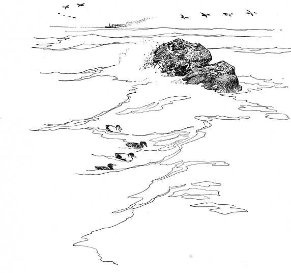 The first thing noticed was that the birds were acting queerly, dipping their heads under water and keeping them there for a full minute or more at a time. That was also curious, for the water under them was too deep for feeding, and the eiders prefer to wait till the tide falls and then gather the exposed shellfish from the rocks, rather than to dive after them like a coot. Darkness came on speedily to hide the birds, who were still dipping their heads as if bewitched, and I went away no wiser for my watching.