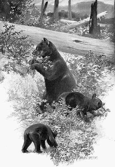 To the hunter without a gun there is no close season on any game, and a doe and her fawns are better hunting than a ten-point buck. By land or water he is always ready; there are no labors for effects, except what he chooses to impose upon himself; no disappointments are possible, for whether his game be still or on the jump, shy as a wilderness raven or full of curiosity as a blue jay, he always finds something to stow away in his heart in the place where he keeps things that he loves to remember. All is fish that[274] comes into his net, and everything is game that catches the glance of his eye in earth or air or water. Now it is the water-spiders—skaters the boys call them—that play a curious game among the grass stems, and that have more wonderful habits than the common balloon spiders which sometimes turned Jonathan Edwards' thoughts from the stern, unlovable God of his theology to the patient, care-taking Servant of the universe that some call Force, and others Law, and that one who knew Him called The Father, alike among the lilies of the field and in the cities of men. Now it is an otter and her cubs playing on the surface, that sink when they see you and suddenly come up near your canoe, like a log shot up on end, and with half their bodies out of water to see better say w-h-e-e-e-yew! like a baby seal to express their wonder at such a queer thing in the water. Now it is a mother loon taking her young on her back as they leave the eggs, and carrying them around the lake awhile to dry them thoroughly in the sun before she dives from under them and wets them for[275] the first time; and you must follow a long while before you find out why. Now it is a bear and her cubs—I watched three of them for an hour or more, one afternoon, as they gathered blueberries. At first they champed them from the bushes, stems, leaves and all, just as they grew. Again, when they found a good bush, a little one with lots of berries, they would bite it off close to the ground, or tear it up by the roots, and then taking it by the stem with both paws would pull it through their mouths from one side to the other, stripping off every berry and throwing the useless bush away. Again they would strike the bushes with their paws, knocking off a shower of the ripest berries, and then scrape them all together very carefully into a pile and gobble them down at a single mouthful. And whenever, in wandering about after a good bush, one of the cubs spied the other busy at an unusually good find, it gave one a curious remembrance of his own boyhood to see the little fellow rush up whimpering to get his share before all the bushes should be stripped clean.