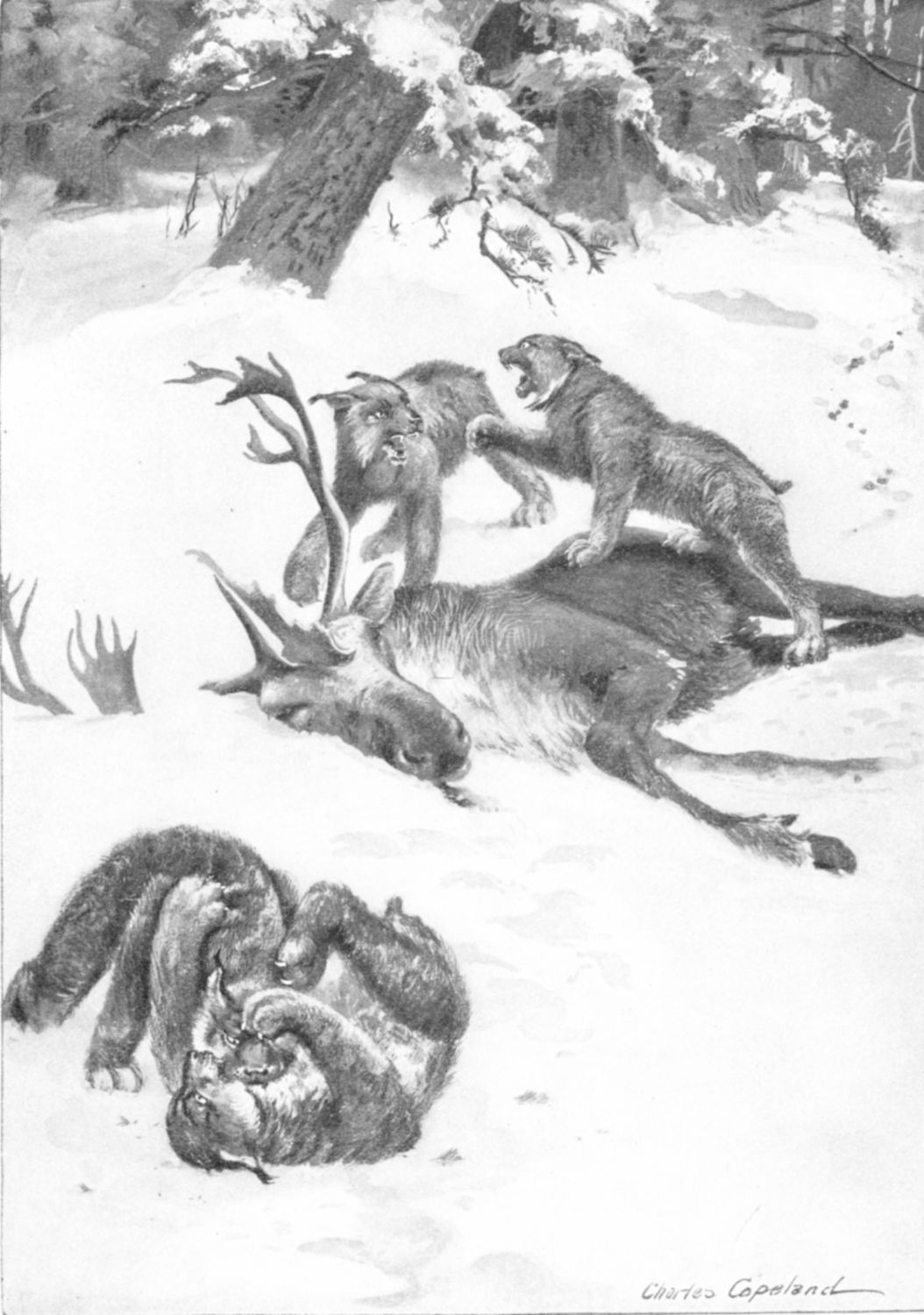 The feast stopped at the first alarm. The marten disappeared instantly. The foxes and the fisher and one lynx slunk away. Another, which I had not seen, stalked up to the carcass and put his fore paws upon it, and turned his savage head in my direction. Evidently other lynxes had come in to the kill beside the five I had followed. Then all the big cats crouched in the snow and stared at me steadily out of their wild yellow eyes.
