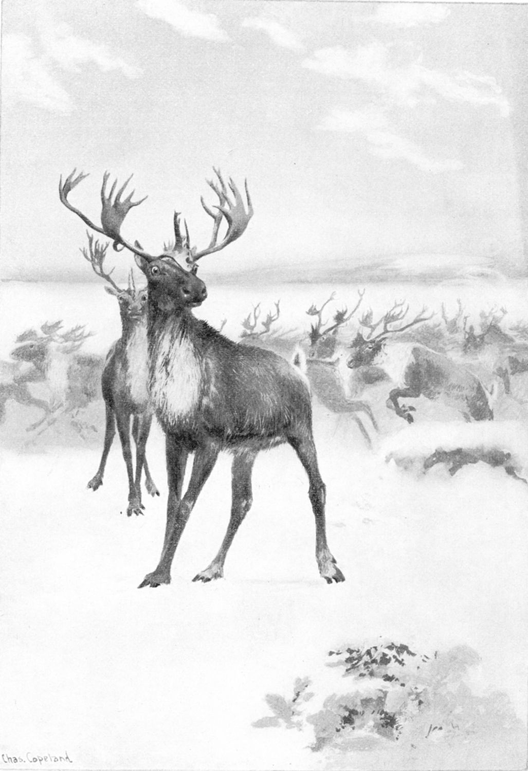 So they came on swiftly, magnificently, straight on to the cover behind which I crouched with nerves thrilling as at a cavalry charge,—till I sprang to my feet with a shout and swung my hat; for, as there was meat enough in camp, I had small wish to use my rifle, and no desire whatever to stand that rush at close quarters and be run down. There was a moment of wild confusion out on the barren just in front of me. The long swinging trot, that caribou never change if they can help it, was broken into an awkward jumping gallop. The front rank reared, plunged, snorted a warning, but were forced onward by the pressure behind. Then the leading bulls gave a few mighty bounds which brought them close up[4] to me, but left a clear space for the frightened, crowding animals behind. The swiftest shot ahead to the lead; the great herd lengthened out from its compact mass; swerved easily to the left, as at a word of command; crashed through the fringe of evergreen in which I had been hiding,—out into the open again with a wild plunge and a loud cracking of hoofs, where they all settled into their wonderful trot again, and kept on steadily across the barren below.
