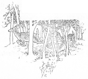 At sight of me she stopped short, trembling violently, her ears pointing forward like two accusing fingers, an awful fear in her soft eyes as she saw her little ones with her archenemy between them, his hands resting on their innocent necks. Her body swayed away, every muscle tense for the jump; but her feet seemed rooted to the spot. Slowly she swayed back to her balance, her eyes holding mine; then away again as the danger scent poured into her nose. But still the feet stayed. She could not move; could not believe. Then, as I waited quietly and tried to make my eyes say all sorts of friendly things, the harsh, throaty K-a-a-a-h! k-a-a-a-h! the danger cry of the deer, burst like a trumpet blast through the woods, and she leaped back to cover.