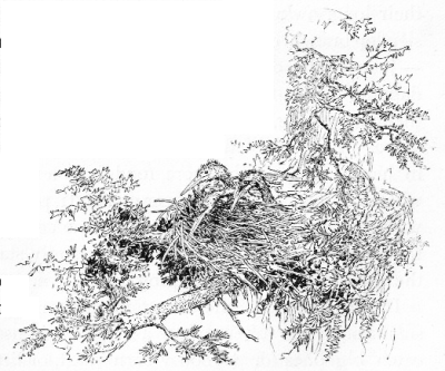 I led them slowly back to their hiding place, gave them a last lick at my hands, and pushed them gently under the hemlock curtain. When they tried to come out I pushed them back again. “Stay there, and mind your mother; stay there, and follow your mother,” I kept whispering. And to this day I have[9] a half belief that they understood, not the word but the feeling behind it; for they grew quiet after a time and looked out with wide-open, wondering eyes. Then I dodged out of sight, jumped the fallen log to throw them off the scent should they come out, crossed the brook, and glided out of sight into the underbrush. Once safely out of hearing I headed straight for the open, a few yards away, where the blasted stems of the burned hillside showed faintly through the green of the big woods, and climbed, and looked, and changed my position, till at last I could see the fallen tree under whose roots my little innocents were hiding.