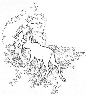 I knelt down quietly beside my fire, slipping on a great roll of birch bark which blazed up brightly, filling the woods with light. There, under a spruce, where a dark shadow had been a moment agone, stood the mother, her eyes all ablaze with the wonder of the light; now staring steadfastly into the fire; now starting nervously, with low questioning snorts, as a troop of shadows ran up to play hop-scotch with the little ones, which stood close behind her, one on either side.
