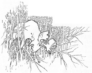It was fascinating sport always, whether the trout were rising or not. One had to fish with his ears, and keep most of his wits in his hand, ready to strike quick and hard when the moment came, after an hour of casting. Half the time you would not see your fish at all, but only hear the savage plunge as he swirled down with your fly. At other times, as you struck sharply at the plunge, your fly would come [23] back to you, or tangle itself up in unseen snags; and far out, where the verge of the firelight rippled away into darkness, you would see a sharp wave-wedge shooting away, which told you that your trout was only a musquash. Swimming quietly by, he had seen you and your fire, and slapped his tail down hard on the water to make you jump. That is a way Musquash has in the night, so that he can make up his mind what queer thing you are and what you are doing.