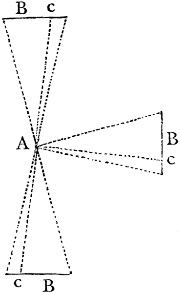 Let A be the eye, B the picture (in section) and c the horizon of the picture.—The eye is always the36 apex of the cone; there is constantly the same relation between the parts in every position. It must be observed that there is a defect in this illustration which it was impossible to avoid—for tho’ I have considered A as the eye, yet upon paper, it is artificial as well as the picture B. If you cannot make this distinction, I propose the following demonstration.——Take a landscape and stand it upon a table—hang it up the height of the eye—above the height—put it upon a chair—upon the floor—it still, perspectively considered, is seen equally well—for