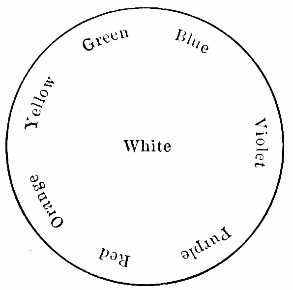 [15] The ordinary mixing of pigments is not an addition, but rather, as Helmholtz has shown, a subtraction, of lights. To add one color to another we must either by appropriate glasses throw differently colored beams upon the same reflecting surface; or we must let the eye look at one color through an inclined plate of glass beneath which it lies, whilst the upper surface of the glass reflects into the same eye another color placed alongside—the two lights then mix on the retina; or, finally, we must let the differently colored lights fall in succession upon the retina, so fast that the second is there before the impression made by the first has died away. This is best done by looking at a rapidly rotating disk whose sectors are of the several colors to be mixed.