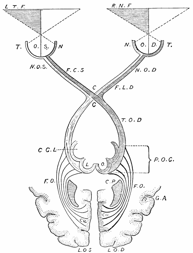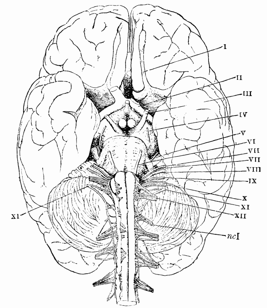 [3] Thus the optic nerve-fibres are traced to the occipital lobes, the olfactory tracts go to the lower part of the temporal lobe (hippocampal convolution), the auditory nerve-fibres pass first to the cerebellum, and probably from thence to the upper part of the temporal lobe. These anatomical terms used in this chapter will be explained later. The cortex is the gray surface of the convolutions.
