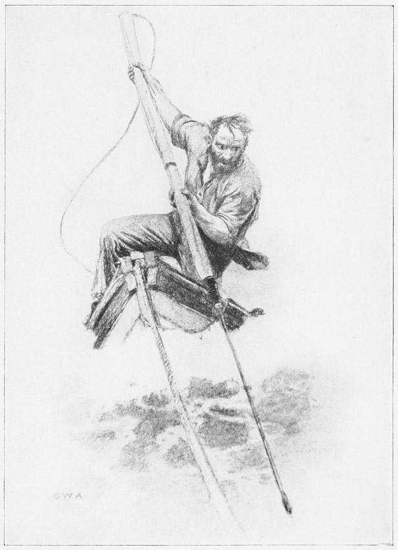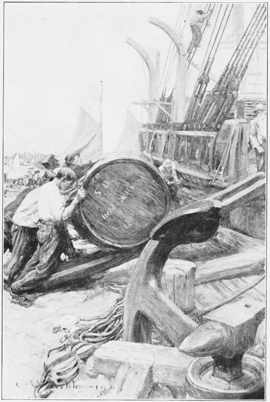As long as I was pretty small I was fairly well contented to sit on the stringpiece, with the sun on my back, and watch my father; or to sit on one of the low, smooth, round-butted mooring-piles—always called “spiles” in New Bedford—and gaze out over the harbor. It was a beautiful harbor. It is a beautiful harbor now; but there seems to me to be something lacking, and less of that atmosphere of peace and serenity which I loved. Although there are still a few of the old square-riggers left there are many days and weeks together when not one of them is at the wharves, and I have not seen a vessel hove down in many years. It is no longer to be expected that, as one turns into Hamilton Street, there will appear the once familiar tracery of masts and yards hanging like a net before his eyes; not a forest of masts, perhaps, but enough of them to warm his heart. Some of the yards had sails hanging from them and flapping gently in the breeze, and on some the sails were neatly furled, but most of them were bare. A jobbing wagon would be driven upon the wharf in a whirl of the black dust, and would discharge its load of sailors, many of them natives of one of the Western Islands, or of Brava, some very black, as I recall them, with great hoops of thin gold in their ears; and their dunnage, some of it in sea-chests, but much done up in shapeless bundles in a gay colored cloth or in a sheet. They were fine, upstanding men, talking and laughing among themselves, and the familiar way in which they handled the lances and harpoons and the other boat-gear excited my envy. They had come from the home of such gentry in South Water Street, a part of the town known as Fayal. Fayal—the South Water Street Fayal—had an unsavory reputation.