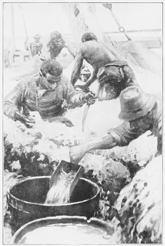 The Vineyard boat went curving out in a wide sweep, another came in; a tugboat pursued its leisurely way across the harbor, and I held my breath in fear lest it should be bound for the Clearchus—with her crew of two; a lightship began to warp into the next dock above, preparatory to heaving down for repairs; the Custom House boat started out with an inspector to meet a ship that had been sighted down the bay; two catboats started from Al Soule’s for the same purpose; riggers and stevedores were busy on a whaleship in the dock next below, getting her spars up and bending on sails; the leisurely activities of New Bedford Harbor of nearly fifty years ago went on; the sun was warm and the wind light, and the smell of tar and sperm oil was heavy on the air, but in the lee of the hill the oil smell overpowered everything else. I liked that sickish smell of crude sperm oil. I like it yet. With that smell in my nostrils I have but to close my eyes and I see the warm, sunny harbor, some whaler lying in the stream ready to sail, the fluorescent green of the water in the dock—its peculiar color due to a mixture of oil and sewage—some other whaler lying at the wharf with her sails hanging limp from her yards, perhaps a vessel hove down at the other side of the wharf, and I heard the sound of mallets and the laughter and the talk of men on the still air.