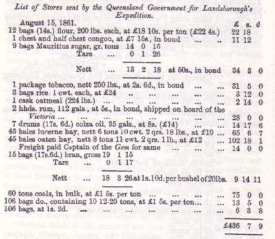 Today we made preparations for proceeding to the Darling River. I sold to Mr. Williams the following articles: Carbine 4 pounds; Enfield rifle 3 pounds; revolver (Colt) small size 4 pounds 10 shillings; cartridges for revolver 12 shillings; steelyards 5 shillings; pick and shovel 5 shillings; 2 1/2 pounds of powder 10 shillings; cartouche box 5 shillings; shoeing tools 15 shillings; four sets horseshoes 8 shillings; spokeshave etc. 4 shillings; 1 1/4 boxes gun caps 9 shillings; three powder flasks (one damaged) 3 shillings; cleaning rod for gun etc. 4 shillings; three boxes gun caps (broken) and pistol cleaning rod 6 shillings; six yards canvas (damaged) 6 shillings; nine saddle-girths (partially damaged) 14 shillings; 6 pounds nails and screws at 1 shilling and 6 pence; medicine 10 shillings; fryingpan 2 shillings; two packsaddles (broken) 2 pounds; crupper 4 shillings and 6 pence. Total 19 pounds 13 shillings and 6 pence. And bought the following supplies: 100 pounds of flour 2 pounds 10 shillings; 24 pounds of sugar 18 shillings; 3 pounds of tea 12 shillings; one bar of soap 4 shillings. Total 4 pounds 4 shillings. The money Mr. Williams gave for the stores was a higher amount than would have been obtained at a township by public auction. Neither did he purchase them so much because he wanted them as to oblige me. He also supplied us with as much beef and butter as we required to take with us, and would not accept payment for any supplies that were raised by themselves.
