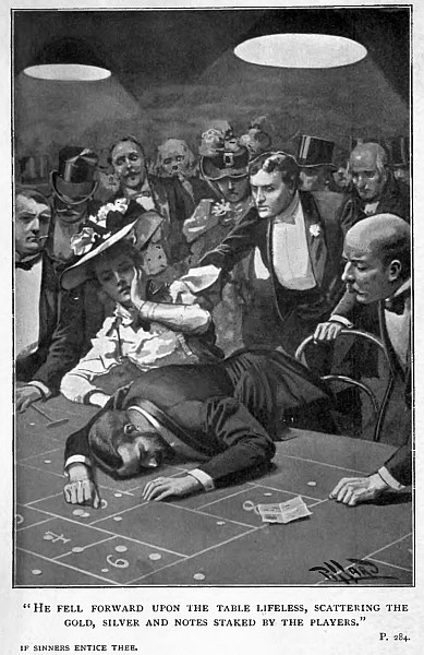 Glaring, rigid and desperate he sat, his dark eyes, the eyes that had been so admired by the women, fixed upon the ever-revolving disc of black and red now holding him in fascination. Suddenly, as another game was being played, a spasm of excruciating pain caused him to clap both hands to his brow and utter a low groan. It was the gasp of a dying man, but amid the terrible excitement of play it passed unnoticed, and none dreamed the truth until a moment or two later when, with a wild, despairing shriek which rang through the hot gilded rooms and caused an instant’s hush, he half-rose from his chair and fell forward upon the table lifeless, scattering the gold, silver and notes staked by the players, and causing a terrible scene of alarm and confusion.
