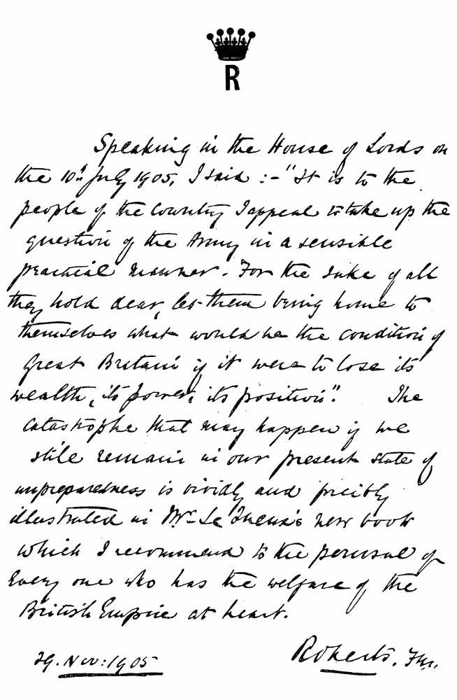 This was the keynote of a solemn warning made in the House of Lords on July 10th of the present year by Earl Roberts. His lordship, while drawing attention to our present inadequate forces, strongly urged that action should be taken in accordance with the recommendations of the Elgin Commission that “no military system could be considered satisfactory which did not contain powers of expansion outside the limit of the regular forces of the Crown.”