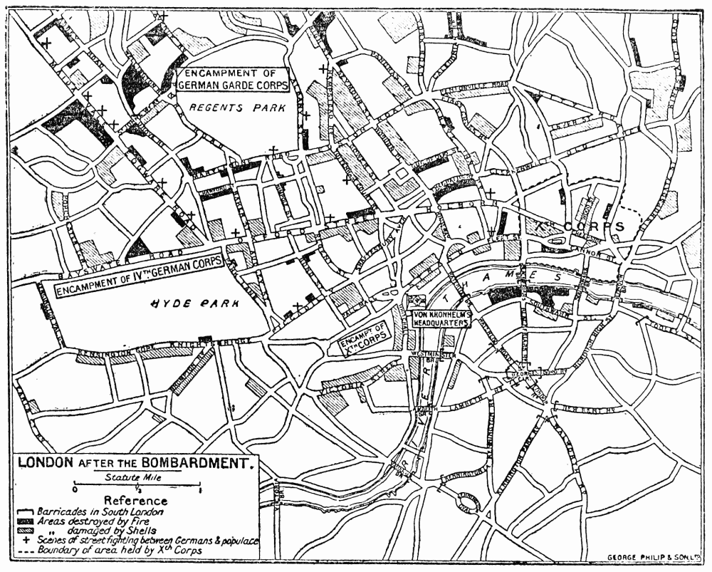 “Yesterday, at the Council of War, however, he was compelled to acknowledge his error when I handed him a scarlet handbill calling upon the British to make a concerted attack upon us at ten o’clock. Fortunately, we were prepared for the assault, otherwise I verily believe that the honours would have rested with the populace in London. As it is, we suffered considerable reverses in various districts, where our men were lured into the narrow side streets and cut up. I confess I am greatly surprised at the valiant stand made everywhere by the Londoners. Last night they fought to the very end. A disaster to our arms in the Strand was followed by a victory in Trafalgar Square, where Von Wilberg had established defences for the purpose of preventing the joining of the people of the East End with those of the West....”{531}