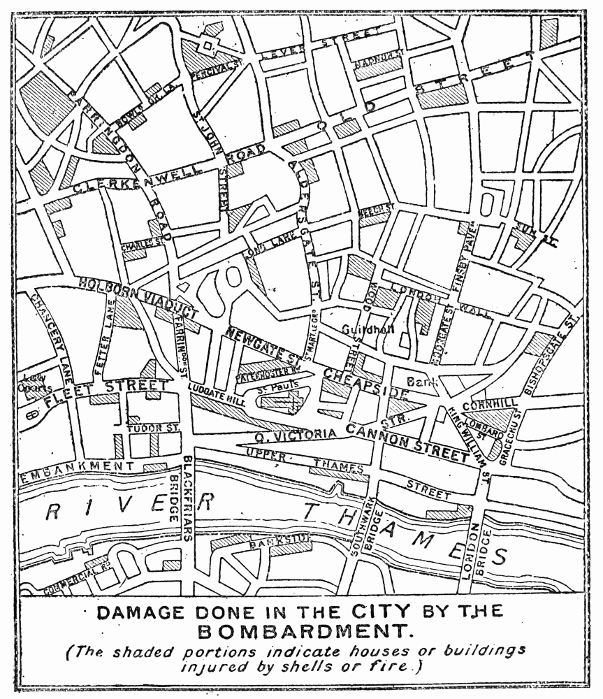 “All the bridges are now open, the barricades are in most cases being blown up, and people are passing and repassing freely for the first time since the day following the memorable bombardment. London streets are, however, in a most deplorable condition. On every hand is ruin and devastation. Whole streets of houses rendered gaunt and windowless by the now spent fires meet the eye everywhere. In certain places the ruins were still smouldering, and in one or two{535} districts the conflagrations spread over an enormous area. Even if peace be declared, can London ever recover from this present wreck? Paris recovered, and quickly too. Therefore we place our faith in British wealth, British industry, and British patriotism.