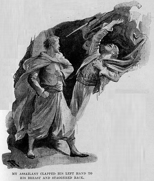 In a second we had closed in deadly embrace. Clutching me by the throat, he forced me backwards, at the same moment uttering a curse and raising the keen blade above his head. For a second it was poised in mid air, but quick as thought I managed to wrench away my right hand, and, bringing it across my breast, fired my revolver full into his dark, sinister face.