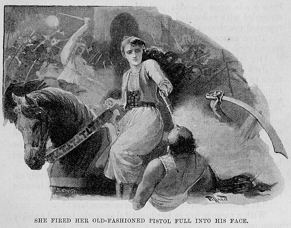 Grasping my revolver, I sprang to my feet and rushed forth. As I did so, a gigantic Arab barred my passage. The fierce, dark-faced fellow had just swung himself from his horse, and in his sinewy hand there gleamed a long curved knife.
