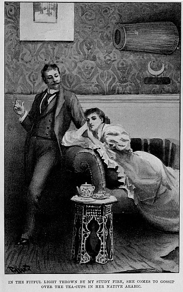 Zoraida, who is now beginning to chatter English fluently, no longer looks askance at our insular manners. Though she has exchanged her serroual and zouave for a tailor-made gown, and her little pearl-embroidered skull-cap for a milliner’s confection of feathers and flowers, yet, happily, our civilisation does not civilise her to feminine foibles. Still an Oriental, she views many of our customs with a horror that oft-times causes me considerable amusement, but she is never so happy as when at evening, in the fitful light thrown by my study fire, she comes to gossip over the teacups in her native Arabic. Seldom, however, she recalls the horrors of those bygone days when she was Queen of the Sahara, and never without a shudder. She is supremely content in her new world, and has left for ever the parched glaring wilderness that once was her home.