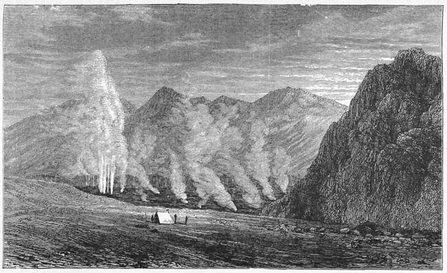 About 3 P.M. I noticed a curious phenomenon. The sun was above the horizon, and was occasionally discernible through the fog—for at this time of the year at this altitude, about 4500 feet, the sun can scarcely be said to set—appearing to move in a circle from the meridian westward, and still keeping above the horizon to almost due north, where it dips for about half-an-hour, appearing again about N.N.E., and by six P.M. it bears due east, some forty degrees above the horizon. A strong current of air was drifting the clouds and fog at our level across the surface of the Jökull from the S.E., while dark masses of cloud were perfectly discernible passing at a very rapid rate across the face of the sun from a precisely opposite direction.