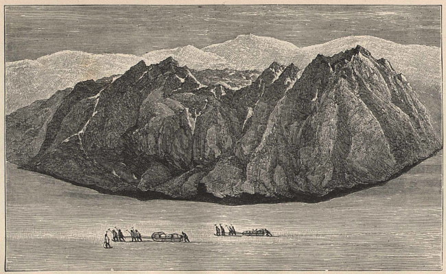 This was the manner in which we now camped, six of us occupying the sleeping-bag, much after the[34] manner of sardines in a sardine box, the remaining four, who were only to accompany us as far as Mount Paul, made themselves as comfortable as they could with rugs and mackintosh coats in the front part of the tent. I ordered every man to fill his flask with snow and put it in his pocket, that each might have a drink of water when he awoke, and in the course of an hour nothing could be heard but the heavy, stentorian breathing of nine out of ten of our party. Having posted up my diary, I slept well for an hour, when I was awakened by a sudden commotion at the other end of the tent. I called out to Paul for an explanation, saying, “Holloa! what’s the matter at your end?” He replied in a deep, solemn voice, “Now is the dumb beating his feet.” Although our dumb friend’s feet were doubtless cold, I could not allow that method of warming them in a tent only 10 by 6½ feet, and I therefore directed that another man should chafe the dumb man’s feet and cuddle them up in his arms. The morning brought us only fog and storm, but after a few hours the latter abated. I served out some warm soup, and we got under weigh. After an hour the fog became so dense, the snow so soft and deep, and a determined sleet had set in, that I was obliged reluctantly to call a halt. Between nine and ten in the evening the weather cleared, the wind shifted to the north-west and the sun came out,[35] and we again advanced; but the snow being up to our knees, I perceived I was tiring my men. So after going on a few miles I again halted, as it had begun to freeze, and the probability was that in about two hours the snow would be firm enough to travel on. Casting up a bank of snow to windward, we six turned into our bag upon the surface of the snow, leaving the tent and all other wraps for our four extra men.