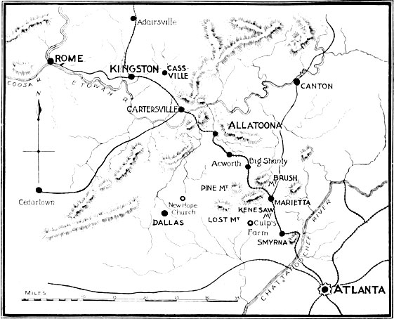 From Atlanta to Allatoona, near the railway crossing of the Etowah, is, as the crow flies, 32 miles Northwest by West. From Allatoona to Rome is 30 miles W. N. W. Thirteen miles from Allatoona towards Atlanta is Kenesaw, the railway sweeping round its North and East flanks. Fifteen miles West by South from Kenesaw, and the same [Pg 11]distance Southwest from Allatoona, is Dallas, in the vicinity of New Hope Church, where had been three days of heavy fighting late in May. Rome again is equi-distant from Dallas and from Allatoona 30 miles. The central position of Allatoona is evident; and it will also be seen that a force at Dallas occupied, in a sense, a strategic point, whence a rapid movement could be made either upon Allatoona or Rome, with the West and Southwest to fall back upon in case of need.