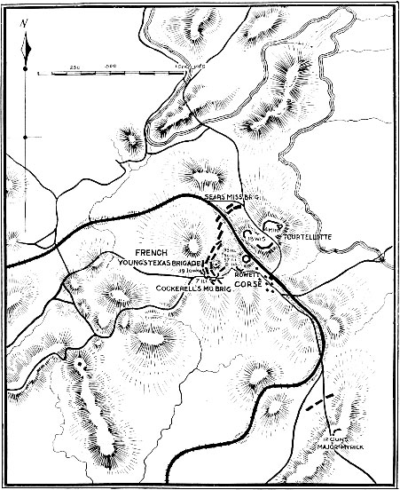 He rapidly made his dispositions for assault, sending Sear’s Mississippi Brigade round by the left to gain the north flank of the works, while Cockerell’s Missouri Brigade formed line across the ridge, with Young’s Texas Brigade behind it to support and follow up the attack. Myrick had been ordered to open up with his guns and continue his fire until the attacking troops were so close up to the works as to prevent it. Sears, having the longer distance to traverse, was to begin the assault when Cockerell would immediately move forward. Sears was delayed by the ruggedness of his route to the north side of the works, and in fact for a time lost his bearings among the wooded hills, and was not in position until 9 a. m. by French’s time. French says that when he sent his summons to surrender, the Federal officer entrusted with the missive was allowed 17 minutes within which to bring the answer, and this time expiring, Maj. Sanders returned without any. Nothing is said in the report as to the firing upon him, noted in the endorsement on the copy of the summons already mentioned.