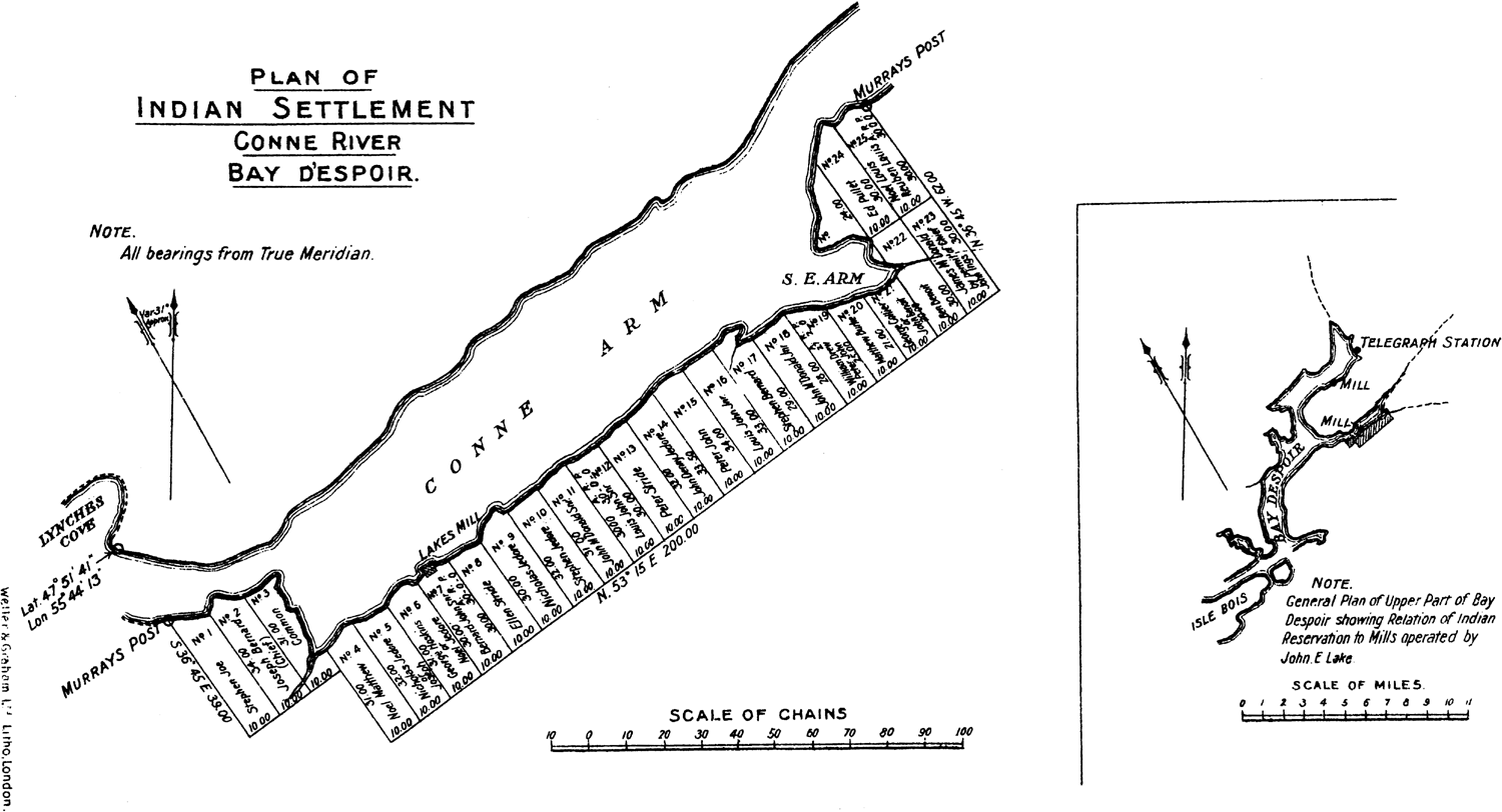 2. The Micmac settlement is on a reservation situated on the eastern side of the Conne arm of the bay, with a frontage to the water of 230 chains, with an average depth of about 30 chains. It is on the slope of a wooded hill which is generally steep down to the sea, and at most places hard and rocky, covered by spruce forest. Most of the Micmac houses are on an area of about a quarter of a mile, where the ground is least steep and most suitable for building and gardening. In Appendix I. hereto is given a list of the 23 families, consisting of 131 persons, now living on or near the Reservation; and of the 7 persons that have left it for Glenwood in this Colony. Two years ago three families left the Reservation to settle at Lewisport, and have not returned.